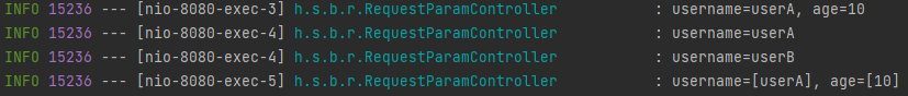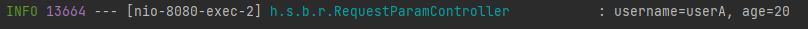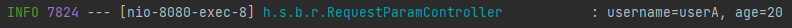로그를 이용하여 해당 요청 파라미터가 잘 넘어왔는지 확인 또 이보다 편하게 작성할 수 있는데 그 방법은 String, int, Integer 등의 단순 타입일 때 쿼리 파라미터 변수명(username, age)과 매핑된 메서드 파라미터의 변수명과 같으면 @RequestParam("변수명")을 생략해도 되며 보통 파라미터 변수명과 쿼리 파라미터의 변수명을 일치시킨다.
