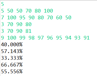 각 케이스마다 한 줄씩 평균을 넘는 학생들의 비율을 반올림하여 소수점 셋째 자리까지 출력한다.