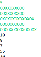 import java.io.BufferedReader; import java.io.InputStreamReader; import java.io.IOException; public class Main { public static void main(String[] args) throws IOException { BufferedReader br = new BufferedReader(new InputStreamReader(System.in)); StringBuilder sb = new StringBuilder(); int test_case = Integer.parseInt(br.readLine()); // 테스트 케이스 for (int i = 0; i < test_case; i++) { int cnt = 0; // 연속횟수 int sum = 0; // 누적 합산 for (byte value : br.readLine().getBytes()) { if (value == 'O') { cnt++; sum += cnt; } else { cnt = 0; } } sb.append(sum).append('\n'); } System.out.println(sb); } }결과화면