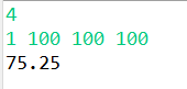 import java.io.BufferedReader; import java.io.IOException; import java.io.InputStreamReader; import java.util.StringTokenizer; public class Main{ public static void main(String[] args) throws NumberFormatException, IOException{ BufferedReader br = new BufferedReader(new InputStreamReader(System.in)); int[] arr = new int[Integer.parseInt(br.readLine())]; StringTokenizer st = new StringTokenizer(br.readLine(), " "); int max = 0; int sum = 0; for (int i = 0; i < arr.length; i++) { arr[i] = Integer.parseInt(st.nextToken()); sum += arr[i]; if(arr[i] > max) max = arr[i]; } System.out.println(((double)sum / max) * 100 / arr.length); } }사실 배열을 이용하지 않고 for문에서 입력받으면 sum 변수에 더해주고 max 값 찾아주는 로직을 구현하면 간단하다.