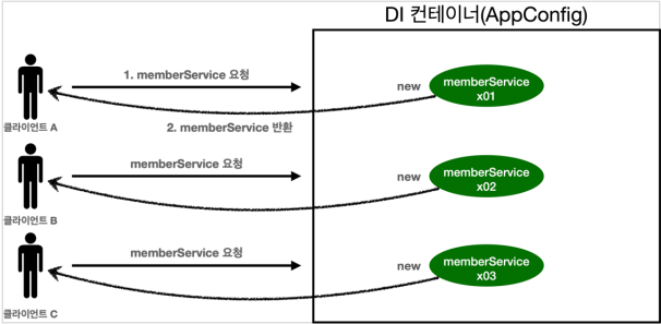 싱글톤 사용 o - 3명의 고객이 요청했을시 해당 인스턴스를 공유하영 사용하는 모습 이제 순수 DI 컨테이너부터 만들어가며 왜 싱글톤 컨테이너가 필요한지 알아보자.