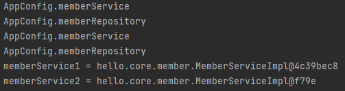 @Configuration public class AppConfig { @Bean public MemberService memberService(){ System.out.println("AppConfig.memberService"); return new MemberServiceImpl(memberRepository()); } @Bean public MemberRepository memberRepository() { System.out.println("AppConfig.memberRepository"); return new MemoryMemberRepository(); } @Bean public OrderService orderService(){ System.out.println("AppConfig.orderService"); return new OrderServiceImpl(memberRepository(), discountPolicy()); } @Bean public DiscountPolicy discountPolicy(){ System.out.println("AppConfig.discountPolicy"); return new RateDiscountPolicy(); } }코드를 보면 memberService Bean을 만드는 코드에서 memberRepository()를 호출하고 roderService Bean을 만드는 코드도 memberRepository()를 호출하여 2번의 new MemoryMemberRepository()를 호출하게 된다. 그러면 2개의 MemoryMemberRepository가 생성되면서 싱글톤이 깨지는 것이 아닌가 생각이 들것이다. 하지만 이러한 문제는 스프링 컨테이너가 해결해주고 있다.