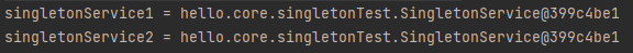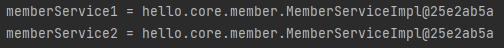 @Test @DisplayName("스프링 컨테이너와 싱글톤") void springContainer(){ ApplicationContext ac = new AnnotationConfigApplicationContext(AppConfig.class); MemberService memberService1 = ac.getBean("memberService", MemberService.class); MemberService memberService2 = ac.getBean("memberService", MemberService.class); System.out.println("memberService1 = " + memberService1); System.out.println("memberService2 = " + memberService2); Assertions.assertThat(memberService1).isEqualTo(memberService2); }