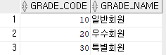 -- 참조될 예시 테이블 생성(부모 테이블) CREATE TABLE USER_GRADE( GRADE_CODE NUMBER PRIMARY KEY, GRADE_NAME VARCHAR2(30) NOT NULL ); -- 다른 테이블을 참조할 예시 테이블 생성(자식 테이블) CREATE TABLE USER_FOREIGNKEY( USER_NO NUMBER PRIMARY KEY, USER_ID VARCHAR2(20) UNIQUE, USER_PWD VARCHAR2(30) NOT NULL, USER_NAME VARCHAR2(30), GENDER VARCHAR2(10), PHONE VARCHAR2(30), EMAIL VARCHAR2(50), GRADE_CODE NUMBER, CONSTRAINT FK_GRADE_CODE FOREIGN KEY(GRADE_CODE) REFERENCES USER_GRADE (GRADE_CODE) );부모 테이블의 칼럼인 GRADE_CODE의 값이 다음과 같다고 하자