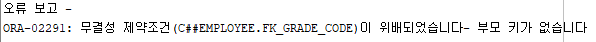 자식 테이블의 컬럼인 GRADE_CODE는 10, 20, 30, NULL 이외에 값이 들어오면 무결성 제약조건을 위배하게 되어 다음과 같은 오류 메시지가 나타난다.