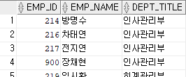 INSERT INTO EMP_01 A( A.EMP_ID , A.EMP_NAME , A.DEPT_TITLE ) ( SELECT E.EMP_ID , E.EMP_NAME , D.DEPT_TITLE FROM EMPLOYEE E LEFT JOIN DEPARTMENT D ON(E.DEPT_CODE = D.DEPT_ID) );