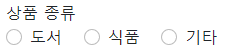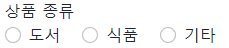 <!-- radio button --> <div> <div>상품 종류</div> <div class="form-check form-check-inline"> <input type="radio" value="BOOK" class="form-check-input" id="itemType1" name="itemType"> <label for="itemType1" class="form-check-label">도서</label> </div> <div class="form-check form-check-inline"> <input type="radio" value="FOOD" class="form-check-input" id="itemType2" name="itemType"> <label for="itemType2" class="form-check-label">식품</label> </div> <div class="form-check form-check-inline"> <input type="radio" value="ETC" class="form-check-input" id="itemType3" name="itemType"> <label for="itemType3" class="form-check-label">기타</label> </div> </div>