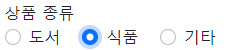 public enum ItemType { BOOK("도서"), FOOD("식품"), ETC("기타"); private final String description; ItemType(String description) { this.description = description; } public String getDescription() { return description; } }- Radio Button을 설명하기위해 생성한 Enum 클래스