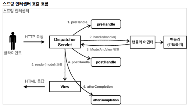HTTP 요청 → WAS → 필터 → 서블릿 → 스프링 인터셉터 → 컨트롤러- 스프링 인터셉터는 디스패처 서블릿과 컨트롤러 사이에서 호출된다.