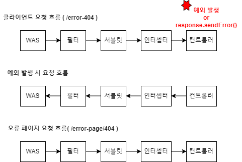 WAS에서는 등록된 ErrorPage의 상태 코드가 오면 해당 Path로 WAS에서 직접 URL 요청을 한다. 이때 의도치 않게 필터, 서블릿, 인터셉터도 다시 한번 호출되는데 로그인 인증 체크와 같은 경우 이미 처음 클라이언트 요청 시 필터나 인터셉터에서 로그인 체크를 완료하였다. 때문에 WAS에서 재요청 시 해당 필터와 인터셉트가 한번 더 호출되는 것은 매우 비효율적이다.