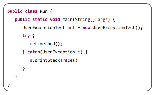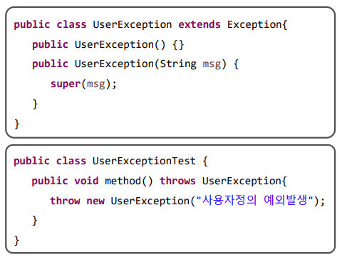 - Exception 클래스를 상속받아 사용자 정의 예외 클래스를 만들 수 있다.