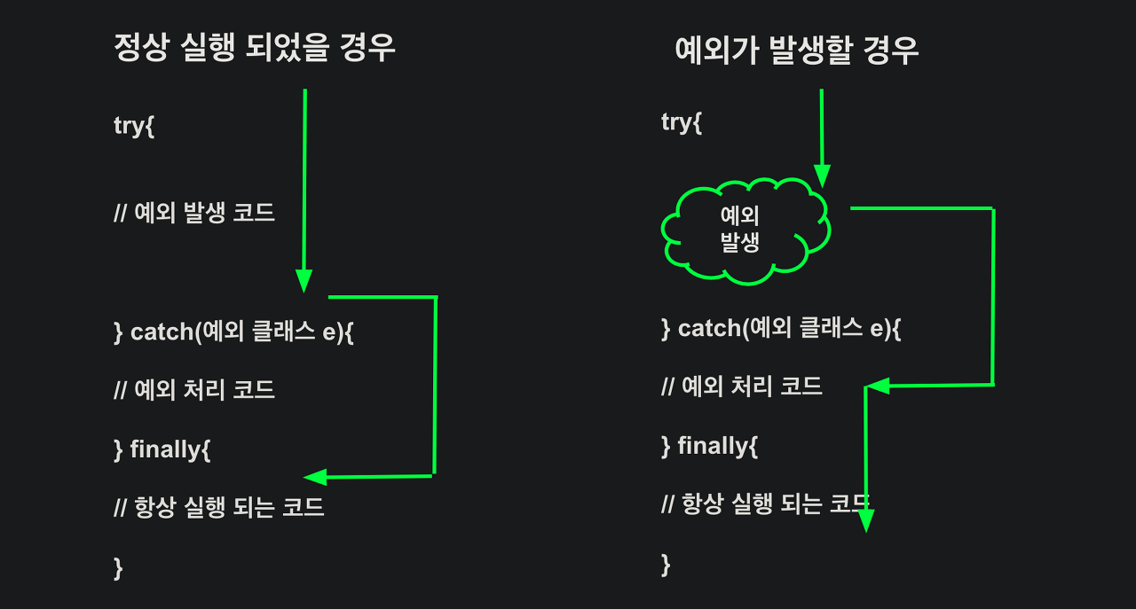 - finally : 예외 발생 여부와 상관없이 실행되는 블록