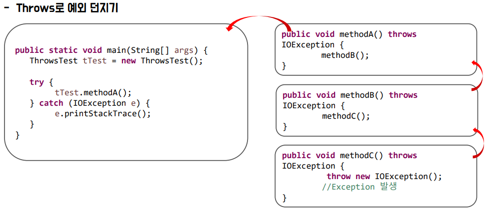 - throws : 예외 처리를 호출한 메서드에게 위임(예외 던지기)
