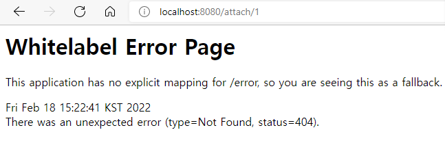 오른쪽은 첨부파일을 클릭시 나타나는 에러 페이지 아직 <a> 태그를 클릭했을 때 해당 경로로 파일을 가져오는 작업을 안 해줬기 때문에 오류가 난다.