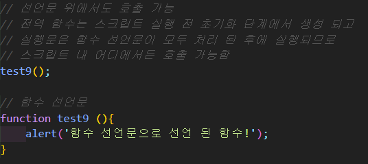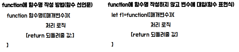 - function키워드에 함수 명을 작성하여 사용하는 방법(함수 선언문)과