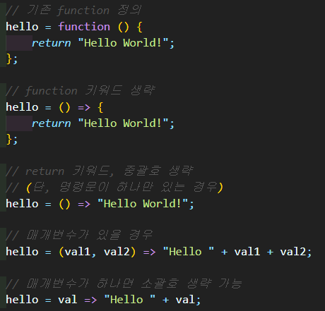 - 화살표 함수는function 키워드, return 키워드 및 중괄호를 생략한 함수 표현식