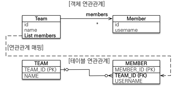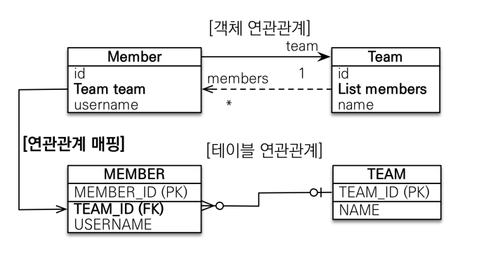 - 객체와 테이블의 차이 때문에 반대편 테이블의 외래 키를 관리하는 특이한 구조