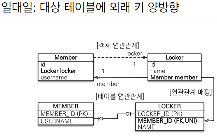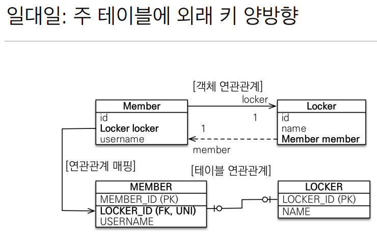 - 일대일 관계는 외래 키에 데이터베이스 유니크(UNI) 제약조건 추가