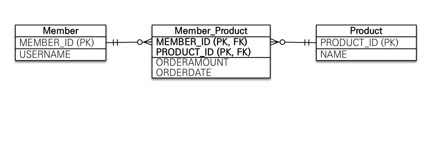 - 관계형 데이터베이스는 정규화된 테이블 2개로 다대다 관계를 표현할 수 없다.