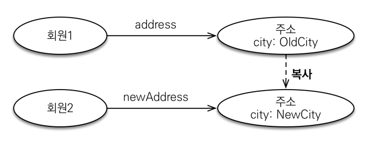 자바 기본 타입은 값을 대입하면 복사가 이루어지지만 임베디드 타입처럼 직접 정의한 값 타입인 객체 타입은 복사가 아닌 공유가 되는 문제가 발생한다.