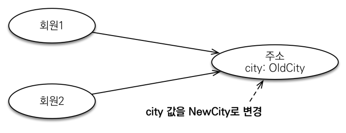 값 타입은 복잡한 객체 세상을 조금이라도 단순화하려고 만든 개념이기 때문에 값 타입은 단순하고 안전하게 다룰 수 있어야 한다. 임베디드 타입과 같은 값 타입의 인스턴스를 여러 엔티티에서 공유하면 위험하다.