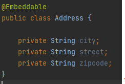 @Entity @Getter @Setter public class EmbedMember { @Id @GeneratedValue @Column(name = "EMBERDMEMBER_ID") private Long id; @Column(name = "USERNAME") private String userName; @Embedded private Period workPeriod; @Embedded private Address homeAddress; // private LocalDateTime startDate; // private LocalDateTime endDate; // // private String city; // private String street; // private String zipcode; }