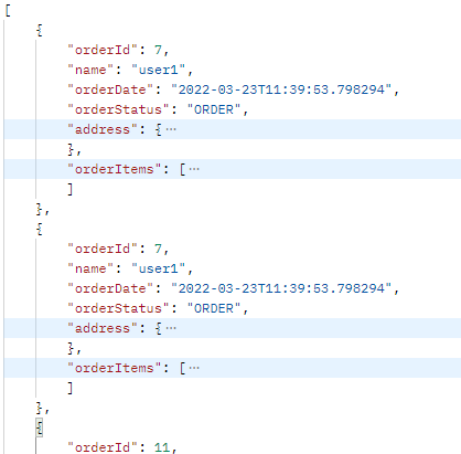 @GetMapping("/api/v2/orders") public List<OrderDto> orderV2() { List<Order> orders = orderRepository.findAllByString(new OrderSearch(null, null)); List<OrderDto> result = orders.stream() .map(o -> new OrderDto(o)) // (1) .collect(Collectors.toList()); return result; } @Data static class OrderDto { private Long orderId; private String name; private LocalDateTime orderDate; private OrderStatus orderStatus; private Address address; private List<OrderItemDto> orderItems; public OrderDto(Order order) { orderId = order.getId(); name = order.getMember().getName(); // (2) orderDate = order.getOrderDate(); orderStatus = order.getStatus(); address = order.getDelivery().getAddress(); // (3) orderItems = order.getOrderItems().stream() .map(orderItem -> new OrderItemDto(orderItem)) // (4) .collect(Collectors.toList()); } } @Getter static class OrderItemDto { private String itemName; private int orderPrice; private int count; public OrderItemDto(OrderItem orderItem) { itemName = orderItem.getItem().getName(); // (5) orderPrice = orderItem.getOrderPrice(); count = orderItem.getCount(); } }- (1) : Order 엔티티를 Dto로 변환