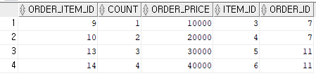 성능 문제를 해결하기 위해 페치 조인을 사용해야 하는데 여기서 페치 조인 시 문제점이 있다. OneToMany 관계(Order와 OrderItem)인 경우는 Order 데이터가 OrderItem의 수만큼 증가가 된다. 무슨 말인지 DB에서 직접 조회하여 확인해보자.