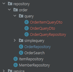 우선 핵심 비즈니스 로직이 아닌 특정 화면에 맞춘 로직을 구현하는 것이므로 패키지를 따로 해서 관리하는 게 좋다. 따라서 특정 화면을 위한 패키지를 생성하여 Repository, Dto를 관리하여 사용하면 역할이 뚜렷해지기 때문에 나중에 유지 보수하기 좋아진다. 다음과 같은 query 패키지 만들어 Repository와 Dto를 생성하였다.